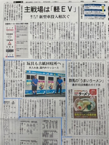 令和7年9月24日の上毛新聞朝刊経済面に、古紙畑鹿ステーションのおもちゃ回収開始の記事が掲載されました。