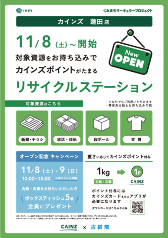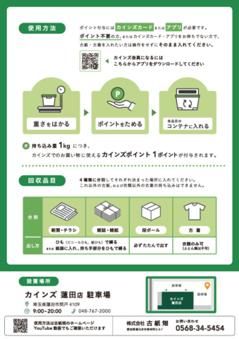 令和7年11月8日、埼玉県蓮田市のカインズ蓮田店駐車場内に【古紙畑プラスカインズ蓮田ステーション】が新しくオープンいたします。