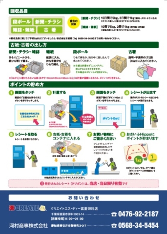 新聞・チラシ、雑誌・雑紙、段ボール、古着は1kgで、【おさいふhippo】に1ポイント入るレシートが出てきます。当日中にレジに持っていけば【おさいふhippo】にポイントを付与できます。